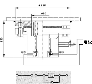 1、電極裝置安裝于油箱底部,開口尺寸φ80,信號裝置安裝在便于觀察使用地方,二者間宜用屏蔽電纜連接并在一點接地。裝于油箱底板的電極裝置有4個電極,可分別并聯使用其中兩個。