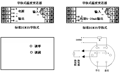 對導軌式溫度變送器輸入可以是熱電偶、熱電阻、標準信號。工作電源接端子1、2,4~20mA輸出信號接3正、4負;對二線制4~20mA輸入信號正接5、負接6;熱電阻單端A接5、并聯端B、C分別接6、7。