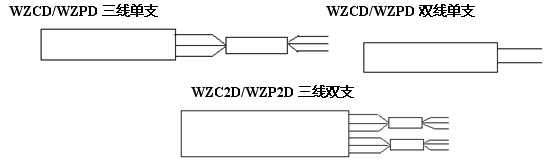 例3:WZC2D-2×12×100-3B-0-Cu50表示:電機用銅電阻雙支溫度傳感器、本體尺寸2×12×100mm,3根引線屏蔽線,每根引線長度400mm,引線屏蔽,分度號為Cu50的銅電阻