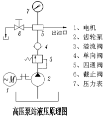 電動機通過聯軸器直接帶動齒輪泵泵油,壓力油經過溢流閥調節通往單向閥到達四通集成塊,分別供給壓力表、調節截止閥和用油對象供油;