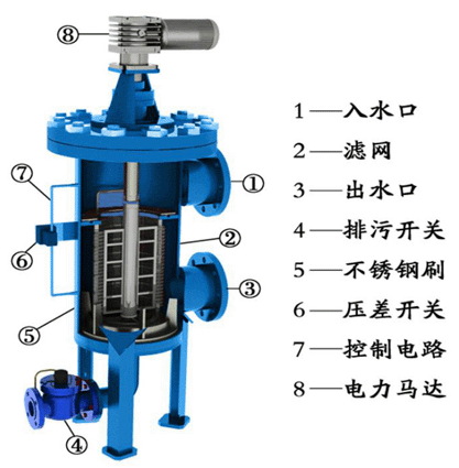 的排污閥;馬達帶動本體濾網內的兩把不銹鋼刷轉動,被濾網所
